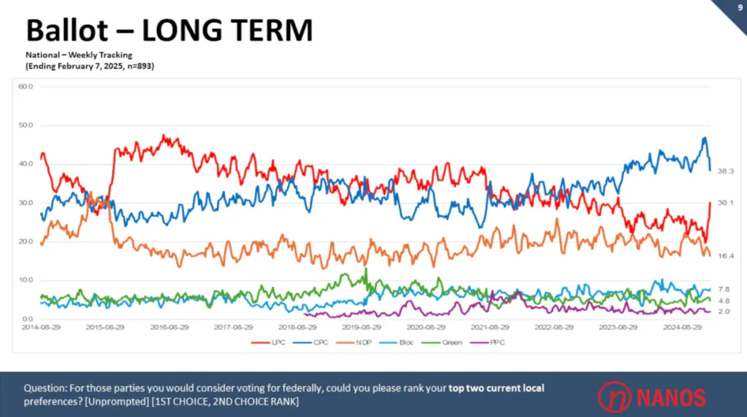 Nanos Research 首席数据科学家Nik Nanos表示:“很明显,保守党的支持率正在大量流失,转向自由党。”