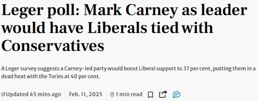 此外,民意调查公司莱格(Leger)的一项调查显示,如果卡尼赢得自由党领导选举,他将抹平过去一年半来保守党享有的巨大领先优势。卡尼领导的自由党支持率将上升六个百分点,达到37%,使其与保守党并驾齐驱。