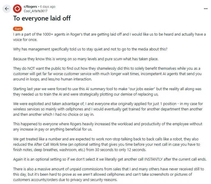 帖文爆出:Rogers公司实际上是利用员工训练AI人工智能,随后大批裁员。管理层还要求员工保持沉默、不得向媒体透露实情。
