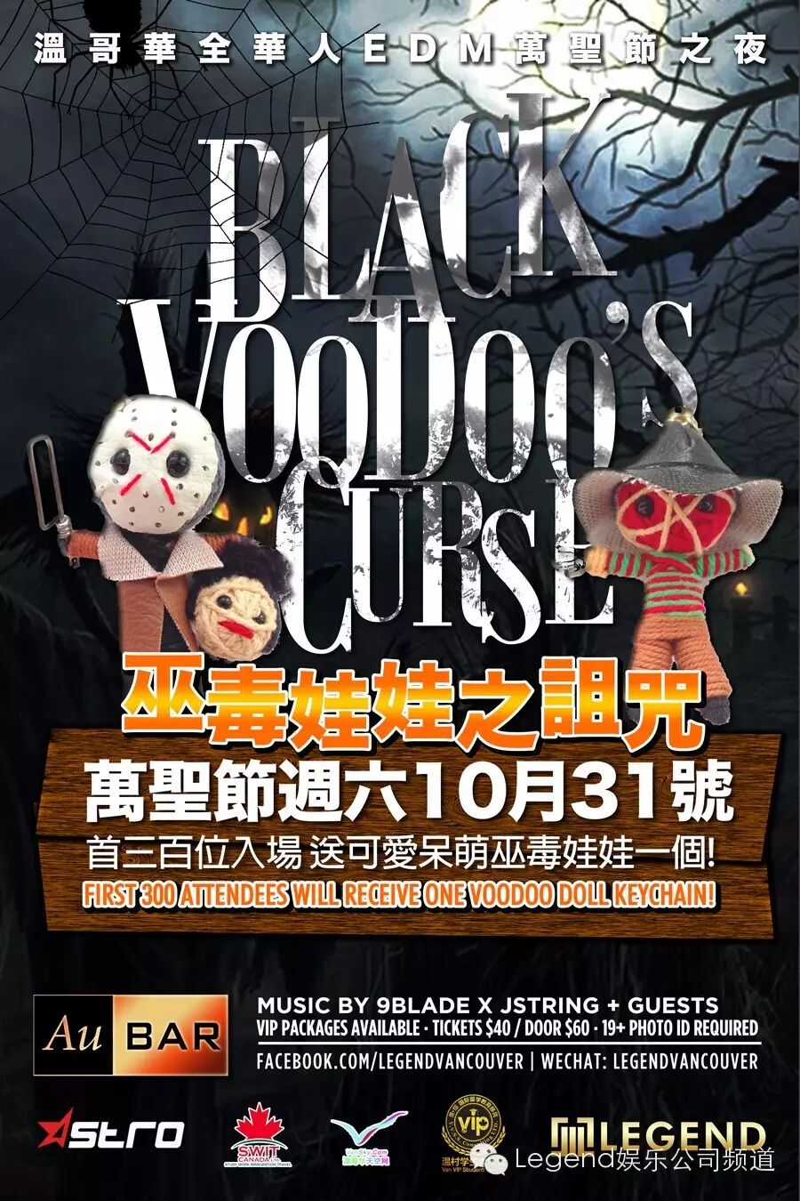 一年一度的萬聖節,Legend@Aubar帶給你「巫毒娃娃之咀咒 Black Voodoo's Curse」。這次Legend首次主辦萬聖節主題的華人EDM夜,連同[溫村學生大本營VVSS][溫哥華天空VanSky][SWIT Canada]為你創造一個比聖誕跨年更嗨更瘋狂的服裝派對。