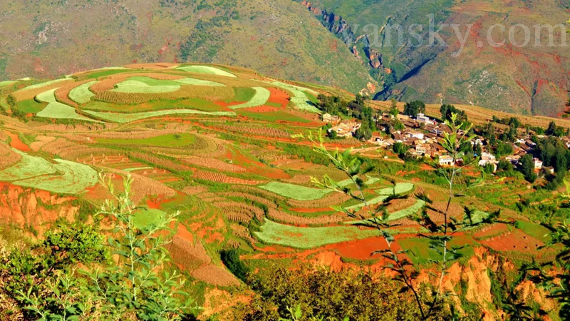 放眼望去,山川和原野呈现出一片片暗红、紫红、砖红等不同的红色,鲜艳浓烈的色块一直铺向天边,看似漫不经心,却又形成如仙境般五彩缤纷的图案。