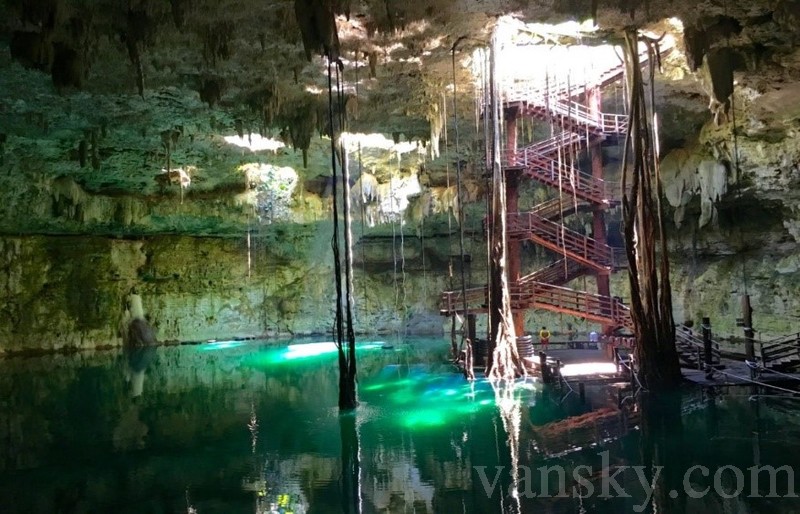 尤卡坦半岛有大小6000多个个天坑深井, 我们只去了两个。一在图伦古城附近,天坑口呈椭圆形,可以看见十几米深处的水源。沿着天坑的一侧建有进入坑底的阶梯 ,方便嬉水的游客。只见大姑娘,小伙子和一群只有半人高的小朋友们兴高采烈地下了坑,扑通扑通地往深蓝色的水里跳,在天气炎热的夏天,这里真是个消暑的好去处!
