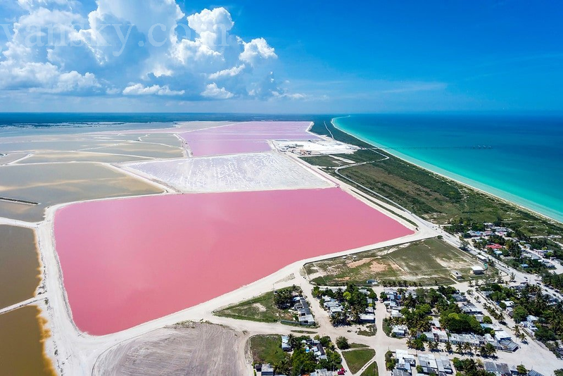 重新上路,经过了几个小时的车程,小导游告诉我们粉红海滩就要到了,大家精神一振,只见我们行驶的公路,一边是碧蓝的大海,一边是粉红的水面,走进一看才知道这不是海滩,而是盐湖。此盐湖不仅色彩美丽,而且历史悠久,从玛雅时期开采至今,历经千年而绵绵不绝。下图右下角的小村落有1600人左右,60%的居民为盐场工作,其余以捕鱼为业,现在又有了新选项,图左下角的粉红盐田进口被村民们塔上了栅栏门,一群村民在此等候,每拨参观的团组均要有一名当地带路党方能进入,并向导游收取费用,真真地落实了“此路是我开,若要从此过,留下买路财”说法,不但制盐能挣钱,看守盐湖也能收银子。