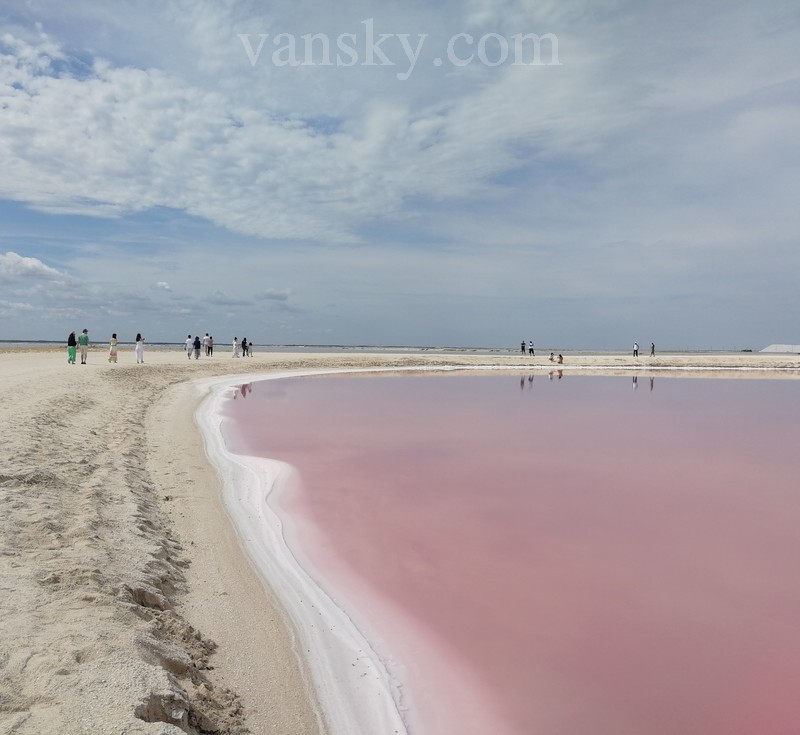 眼前粉色的湖边布满白色的结晶,外圈就是谈黄色的沙子,长方形的粉色大湖如同一袭华丽的公主礼服,镶嵌着闪亮的白色钻石的裙摆,在人们的眼前涂涂展开,如此美丽的景致,来访的人们的眼睛里大概多少都会不由自主地冒出粉红的泡泡!来此地一游的客人多为大姑娘,小伙子或年青的伴侣,大家都想在这奇特的粉红之滨体验一下执子之手的浪漫感觉。