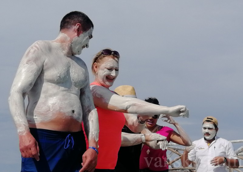 小导游安慰大家,说我们马上就到河里观鸟看鲨鱼啦,还可以用古老的玛雅海泥涂脸涂身,以解大家的满头大汗,貌似都要中暑的窘困。果然,大家分坐在各自的小艇上,在一条海河相连的小河上,长达22公里的河道弯弯曲曲,颇有在亚马逊河流中泛舟的味道,清爽的风吹散了浑身的热气,加上河面上和两岸树丛里飞翔的鹈鹕,灰色鹭鸶和白色水鸟,让人开心不已。小导游和开小艇的小伙子还找到了飘在河边,状似枯木的鳄鱼,将小艇靠近,让大家拍照。小导游将我们的小艇停靠在有白色滩涂的岸边,让大家用白色的泥浆涂脸涂身子,我只顾拍照,没有试用这号称玛雅泥的白色泥浆,拉脱维亚的大叔大婶和其他团友都乐呵呵地享用了。