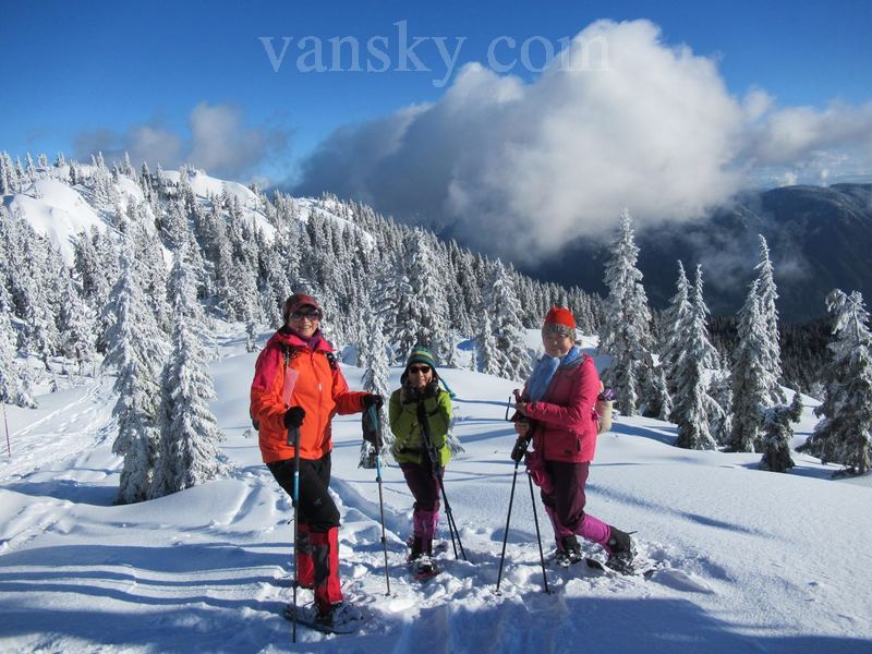 2019年1月7日,是大温哥华地区冬日少有的晴天。暖阳高照、风和日丽。精英徒步友的三位女士,Patricia, 津津和Rui Wang穿雪鞋,登上了白雪皑皑的西蒙山(Mountain Seymour)的一峰(First Peak or Pump Peak) 和二峰(Second Peak or Tim Jones Peak)。这两个峰是较难攀登的,尤其是一峰,最后100米,颇为陡峭,巍巍难行。