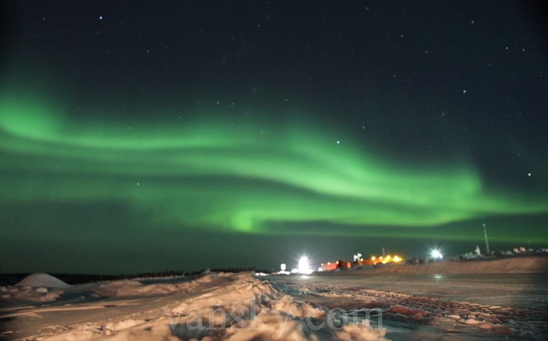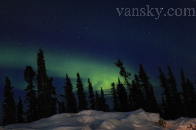 一连几天,一到夜晚,我们总要出去看看夜空的情况,急切地期盼着能看到极光的影子。而北极光就像久盼而不至美丽而羞涩的情人,越想与她亲近,她却丝毫不顾及你的心情,久久地避而不见。让我们心里十分着急,但依然翘首盼望着,期待着。某日清晨,Wendy高兴地宣布;她梦见我们看到极光了!好兆头啊!3月25日,我们已到达了Inuvik城,住宿在城外的小木屋,小木屋地处河岸的高坡上,是个观看极光的好去处。