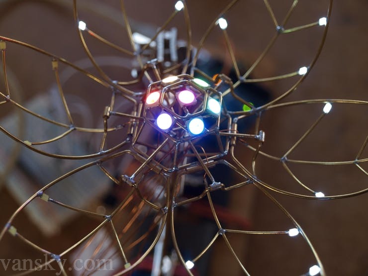在花开的里面,我放了7个LED从内部发光。这些LED只需要控制一根DATA线,并且可以菊花链式连接。我把它们中的6个焊接在两个小六边形之间(当然是另一个模板)。下六边形是地线,上半部分是正电压。将适当的NeoPixels引线焊接到这些六角环上。这些LED放置在45度角下,照射到侧面。为了使其更好,将第七个LED放入上六角的中心。最后但并非最不重要的是连接DATA IN和OUT导致创建菊花链。