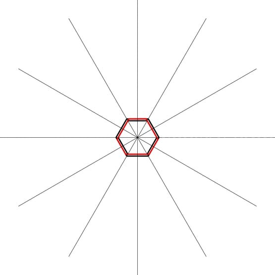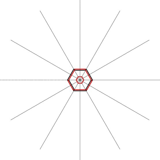 是时候将所有花瓣焊接在一起了。花的基部是六角形 - 6个花瓣。花瓣通过铰链固定在六边形上。然而,六边形略微不规则。我失败很多次。花瓣需要相互重叠,如果六边形是规则的,则不允许。三个花瓣靠近中心(内花瓣),另外三个花瓣稍微偏移(外花瓣)。为此,我创建了一个模板并将其打印在纸上。红色形状是由两个嵌套的正六边形组成的最终不规则六边形。将所有铰链(管道)焊接到六边形上。从模板中心出来的光线将帮助你将花瓣焊接到正确的位置。花瓣的中心需要跟随从六边形中心出来的射线。最后,当你关闭花瓣时,你将拥有最后的花朵形状。