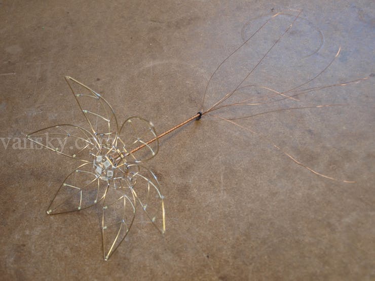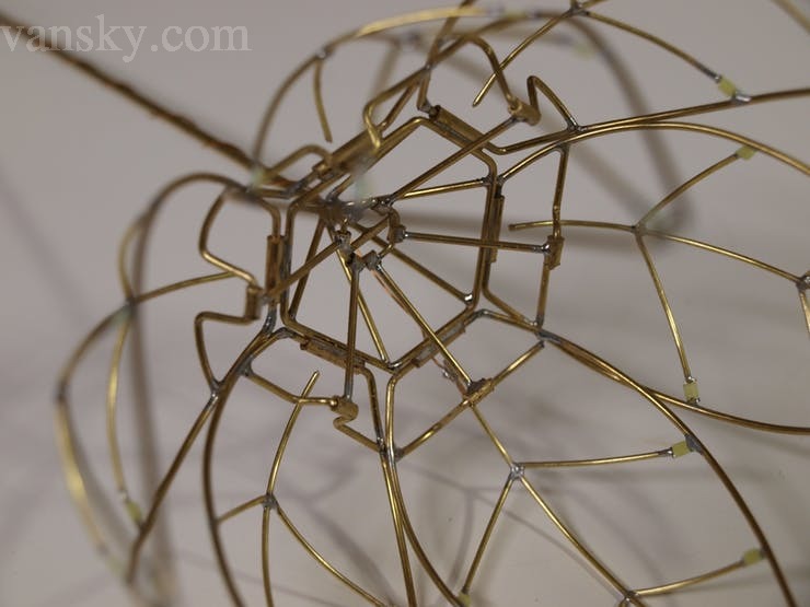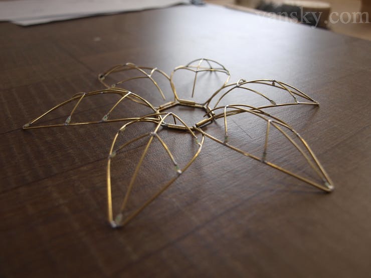 将雌蕊结构放在花的中心。稍微偏离开花六角形底座,为花瓣连杆留出足够的空间。对我来说,它比开花六边形高1厘米。用黄铜棒连接所有顶点,形成坚固的结构。花完成了!现在测试看看花瓣是否仍能自由移动。