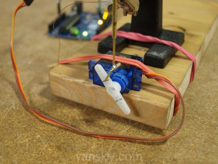 用茎将花固定在向上的位置。将推杆穿过阀杆,头部朝上。垂直于推杆底端焊接短管,并用1mm黄铜线制成一个小连杆,用于连接舵机和推杆(见上图)。应该能够使用舵机上下推动推杆。连接你的Arduino尝试一下。在开始焊接花瓣和推杆头之间的连杆之前,需要使用Arduino调整舵机机芯。编写代码,以便在推杆头端与开花六角形底座齐平的最顶部位置上下移动推杆。在最低位置,它位于开花V形底座的底部。为使推杆运动尽可能柔软,请使用最靠近舵机臂中心的孔。舵机需要旋转更长但步长更短。当推杆向上移动时,推动连杆和花瓣向下。随着它向下移动它连接杆和花瓣被关闭。