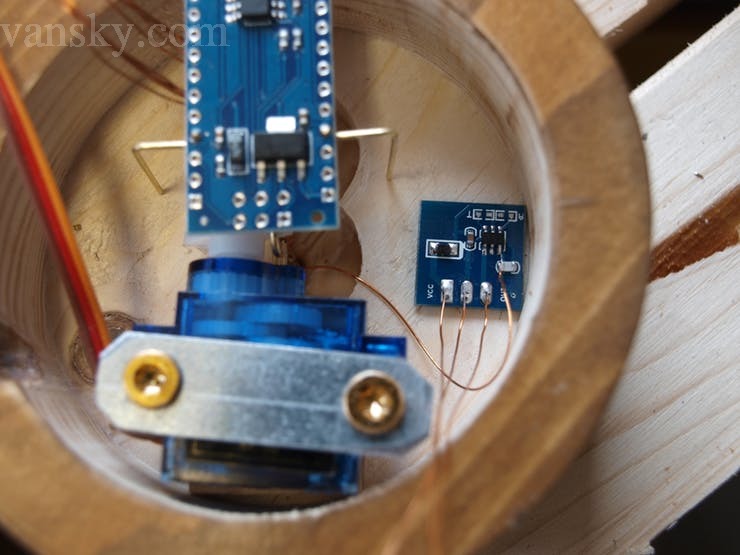 将花倒置。雕塑周围要小心,不要现在打破它!这将是多么浪费!首先,将舵机放入最终位置。它的手臂应该已经从试验台准备好了。只需找到舵机臂在底座内自由移动并将连杆连接到推杆的最佳位置。为了将舵机系统固定到位,我使用了一块金属板和两个螺钉。我希望在舵机故障或放置错误的情况下保持灵活性。但如果你有信心可以粘上它。