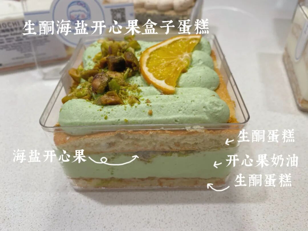 味道:开心果盒子蛋糕的奶油是所有五个当中吃下来最甜然后偏腻的。虽然它腻,但是!小编觉得这个可以反向思维。因为它偏腻,旋几口解解馋之后就不会忍不住一直旋。如此解馋之后就可以避免暴食!喜欢开心果的宝子们也可以搭配茶或者酸梅汤一起吃,就不会腻了。