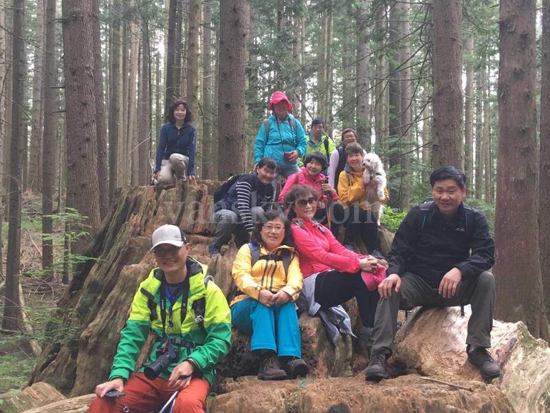 我们一路上都没见到人。只是看瀑布时,来了两伙人。看完瀑布,我们开始午餐。大家或坐或立,吃完后就走上了回程之路。我们还在一个很大的残留的树的根部合了影, 除照相的人外,11个人,至少有9人坐在树的根部上。根把我们留住了,并留下了永恒的照片。