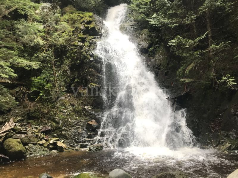 在中途,我们就看到有溪流奔跃而下,跳过巨岩、横木,飞着浪花,感到特别畅快。到了上面,无意发现其源头是一挺大的瀑布 (后来知道叫锯片瀑 Sawblade Fall)。水流奔跳跌荡,分几级跌落而下,最后一级,落差很大。水垂直而下,落在下面的潭中,水花腾起,激扬飞溅,声音轰然如擂鼓。在这林木幽深之处,别有一番景致。同时我还开玩笑说:回去的时候,顺流而下,将是捷径,而且不需寻路。我回来后,赋诗一首: