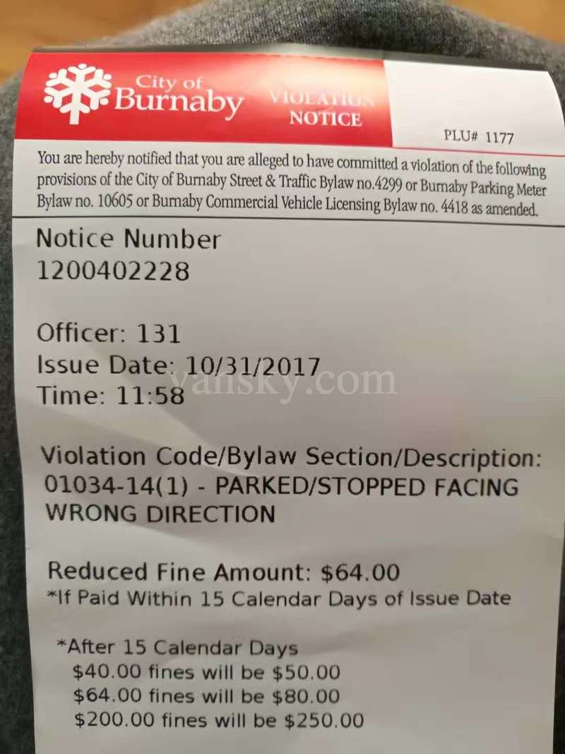 作为來温司机一年多,一直想将自己的囧况分享给大伙儿,给新的來温司机一些贴士,这不还没提笔,今天就在家门口又收到一张罚单,什么是"01034-14(1)-PARKED/STOPPED FACING WRONG DIRECTION" 逆向停车,存在潜在危险,叫天天不应,叫地地不灵,申诉无门,这交规得学多细,才能读到这一条啊。 $64.00罚得不轻啊,我决定认真研究一下交规,整理一些常见的罚单陷阱,分享给大伙儿,我这來温司机一年来的教训或许能为新來温司机省点钱 ,等着我。