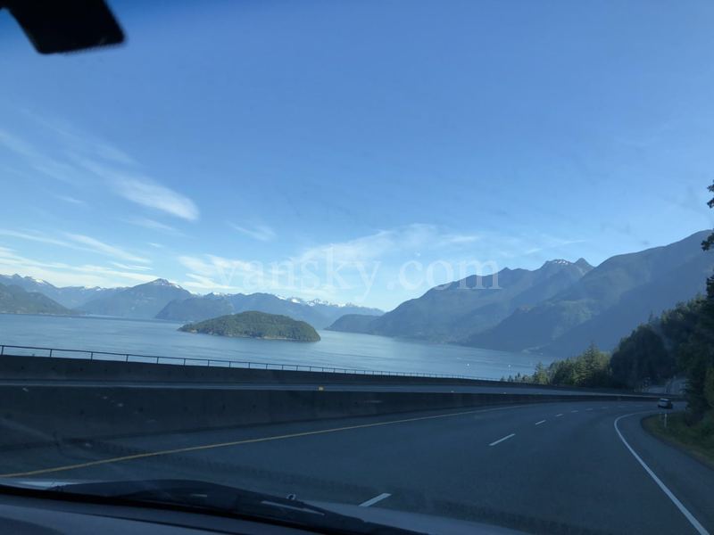 一路上走的是由温哥华到威士勒的海天公路。左侧是海,右侧是山,碧海蓝天,云随山穷,山依水尽,峰回路转,绿岛时现,一个个美景如画在疾驰中扑面而来,颇为惬意。有时也越过在这起伏的路上骑车的骑手,他们奋力前行,令人感奋。