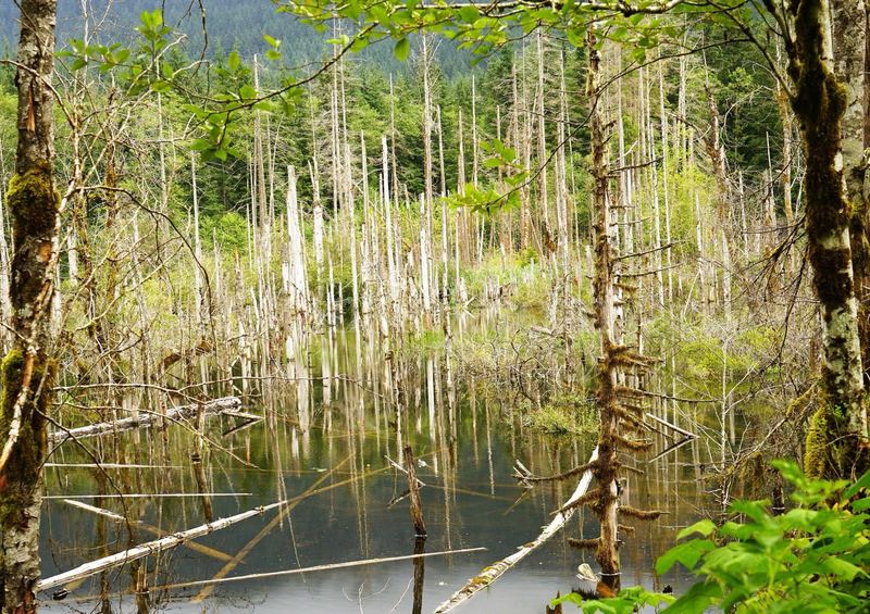 吃完饭我们顺着Spur4路前行。走了不远,在左手边一汪水中看到了一片树林,中间的树木身躯挺然、通体发白、有一些残存的树皮、苔藓和少许斜枝。倒影在水中历历可见。水中还有几棵倒下的白色的树干。林清水静,景致很特殊也很好看。这些树乍一看象是白桦,细看则没有白桦那盎然的枝叶和明媚的象眼睛一样的图案。应该是一次干旱,使这些曾经勃然向上生长,翠绿的她们变成了这样。