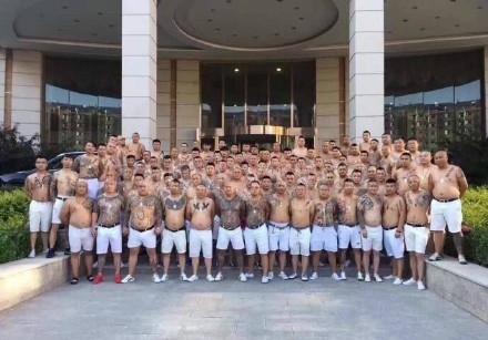 这个天安社到底是个什么组织呢?天安社全称叫天安社兄弟商会,上下老小一共一百多号人,成员形象非常固定,都是一群剃着光头,挺着啤酒肚,戴着大金链子的纹身中年人,虽然是个江苏社团,成员也都以江苏当地人为主,形象上却跟大众对东北社会大哥的刻板印象非常符合。