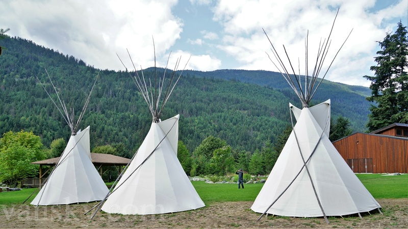 穿过七个隧道后,就看到鬼门关缆车站。它在高速路的另一侧,要到适当的地点,车才能掉头。在我们转过弯时,发现旁边是Tuckkwiowhum Village,一个展示原住民生活的地方。一个高大宽敞的原木建筑十分显眼,旁边有小桥流水、三个原住民住的白色帐蓬屋和一个以圆木为柱子的亭子。计划外的景点,我们当然要进去看看。这里有民居,顺着斜坡一直伸展到菲莎河。也有人在这宿营,大人小孩、人欢狗叫。还有人练射弓箭,把一个人型靶子射得斑斑点点。