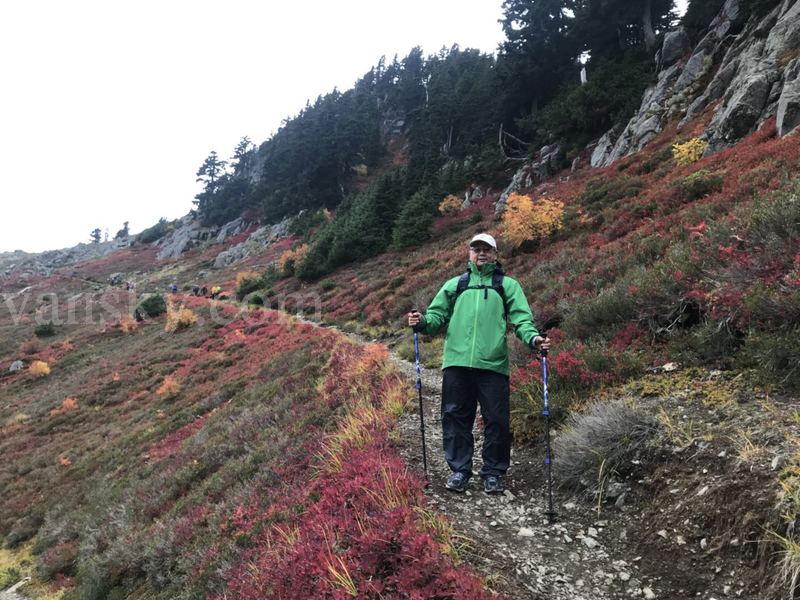 那天天阴,间或有毛毛雨,沾衣不湿。虔诚的登山者不少,上上下下,络络绎绎。大多数人是从加拿大来的,其中不少华人。一对话,有的来自温哥华一单身俱乐部,有的是温哥华附近的城市网上徒步群,有的是亲友。多数是来健行的,也有到这露宿的。露宿的都是年青人,背着大背包,走起来雄赳赳的,负重若轻。还有一伙人,带着两条负重的大狗,狗象马一样驯顺地跟着,不象别的狗,前跑后窜的。